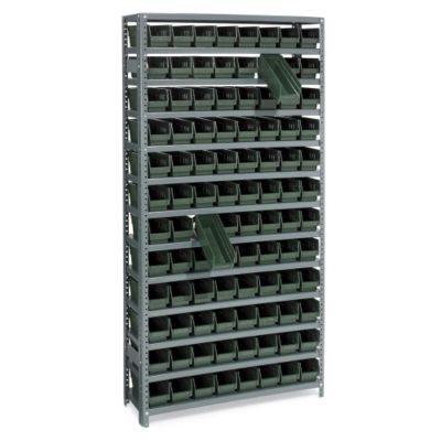 Environmentally friendly shelf bins are made from 100% recycled plastic. Seamless bin interiors maximize filling capacity, while rear lips allows bins to suspend from shelf above. Empty bins can be nested inside one another for space-saving storage. High-density steel shelving includes 13 shelves. 400-lb. capacity per shelf. Read More..