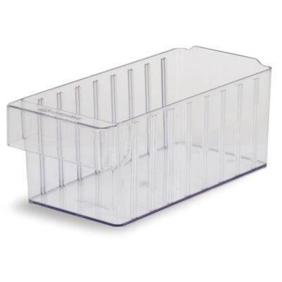 Clear, see-through material allows quick inventory of contents. Durable clear acrylic AKRO-MILS AkroDrawers can be stacked on 12" or 18" deep shelving to optimize storage space. Rear lip suspends drawer from shelf above. Also works with racks and mobile carts or simply place on your worksurface for organized storage. Wide front handle is easy to grip and provides a smooth, flat surface for labels. Order in quantities specified, priced each. Optional dividers sold separately. Read More..