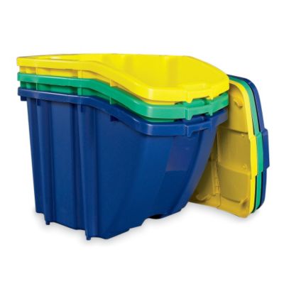 SUNCAST Recycling Hopper Bins let you create an all-in-one recycling center. Includes three binsone blue, one green, one yellow. Front lid stays open. Stacks with or without lid. Nests for storage. Read More..