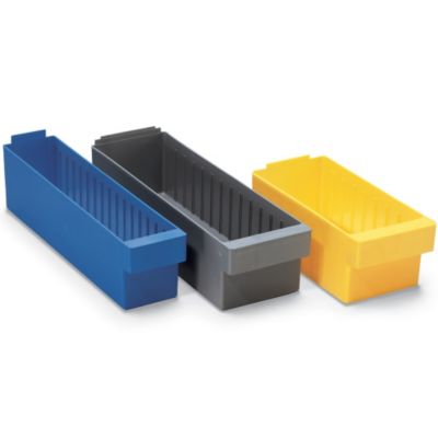 Create a small parts storage system by lining your 12", 18", or 24" deep shelving with these QUANTUM Euro Drawers. Injection-molded, high-impact polystyrene. 12-ga. wall thickness. Curved pull handle accepts labels or bar codes. Rear lip suspends Euro Drawer from shelf above. Order drawers in quantities specified, priced each. Dividers sold separately. Appropriate for lean manufacturing. Read More..